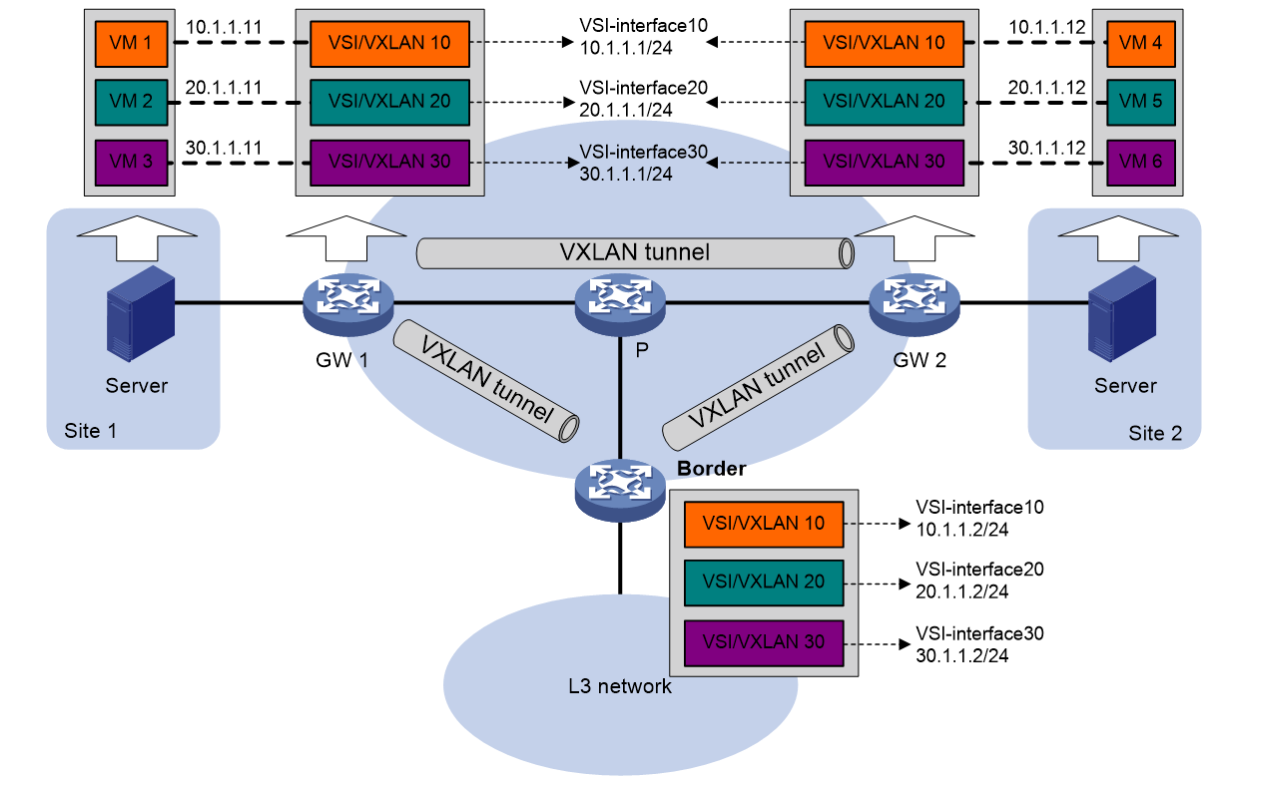 - 三层VNI和VPN实例进行关联,用于VXLAN报文跨子网的转发(详见 EVPN )